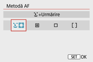 +Urmărire]. Pentru instrucţiuni despre selectarea unei metode AF, consultaţi Selectare Mod AF.
