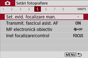 - Evidenţierea MF poate fi dificil de distins la valori ISO mari, în special când este setată o valoare ISO extinsă. Dacă este necesar, micşoraţi valoarea ISO sau setaţi [Evidenţiere] la [Dezactivare].
