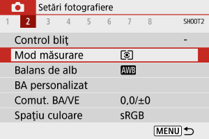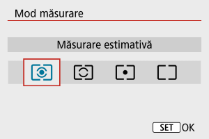 Aveţi patru metode (moduri de măsurare) pentru a măsura luminozitatea subiectului. În mod normal, se recomandă măsurarea estimativă. Măsurarea estimativă este setată automat în modurile Zonă de bază (exceptând modul :