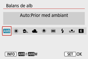 Balansul de alb (BA) este pentru a face ca zonele cu alb să fie albe. În mod normal, setarea Auto [] (Prior med amb) sau [