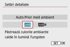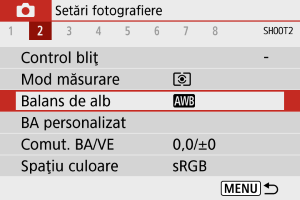 ] (Prioritate alb) vă ajută să obţineţi un balans de alb corect. Dacă nu puteţi obţine culori cu aspect natural cu ajutorul Auto, puteţi selecta balansul de alb pentru a se potrivi cu sursa de lumină sau îl puteţi seta manual fotografiind un subiect alb.
