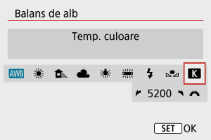 ] la o valoare măsurată cu un dispozitiv de măsurare a temperaturii de culoare disponibil în comerţ, realizaţi fotografii de test pentru a regla setarea aşa cum este necesar pentru a compensa diferenţa dintre dispozitiv şi aparat.