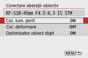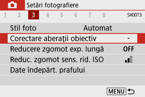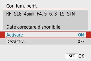 - Atunci când folosiţi un alt obiectiv decât Canon, este recomandată setarea corectării pe [Dezactivare], chiar dacă opţiunea [Date corectare disponibile] este afişată.