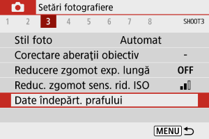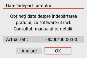 Despre detalii referitoare la Digital Photo Professional (software EOS) pentru a şterge urmele de praf automat, citiţi Manualul de Instrucţiuni pentru Digital Photo Professional.