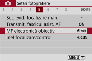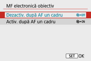 Pentru obiectivele dotate cu focalizare manuală electronică, puteţi specifica cum să fie folosită reglarea manuală a focalizării cu AF un cadru.