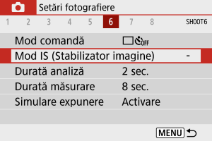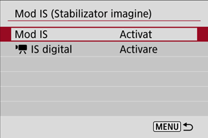 Stabilizarea imaginii din obiectiv reduce mişcarea aparatului în momentul fotografierii. Pentru a activa IS când folosiţi obiective cu IS care nu au buton pentru IS, setaţi [Mod IS] la [Activare] după cum urmează. Setarea [Mod IS] nu este afişată când folosiţi un obiectiv IS care are un butonul pentru IS. În acel caz, setarea comutatorului IS al obiectivului la activează stabilizarea obiectivului.