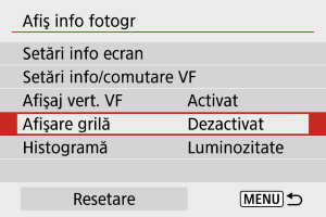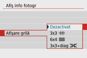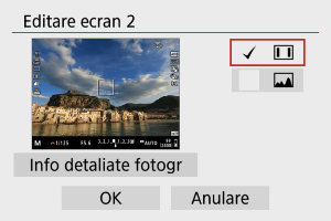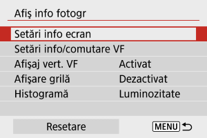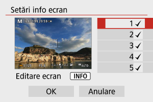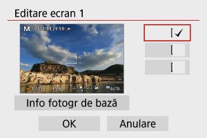 pentru a selecta ecranele cu informaţii pe care să le afişaţi pe aparat.