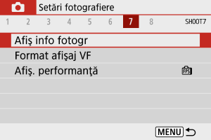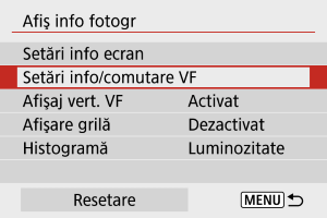 pentru a selecta opţiunile pe care să le afişaţi pe ecranul cu informaţii în vizor.