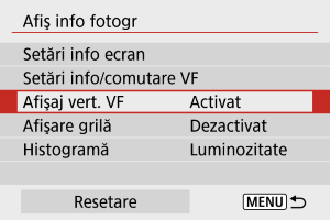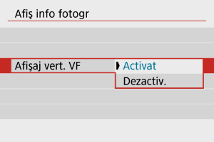 Puteţi selecta cum sunt afişate informaţiile în vizor când fotografiaţi vertical.