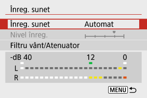 Selectaţi [Nivel înreg.] şi priviţi scala de măsurare a nivelului în timp ce apăsaţi tastele