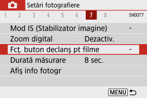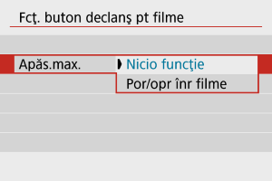 Dacă setaţi [Apăs.max.] la [Por/opr înr filme], puteţi porni/opri filmarea dacă apăsaţi butonul pentru filmare, dacă apăsaţi butonul declanşator complet sau dacă folosiţi telecomanda BR-E1 sau RS-60E3 (ambele comercializate separat).