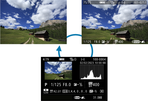Cu ecranul cu informaţii despre fotografiere afişat (), puteţi apăsa butonul pentru a modifica informaţiile afişate în partea de jos a ecranului. Puteţi personaliza informaţiile afişate, în [