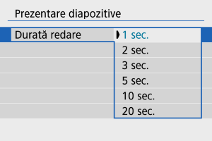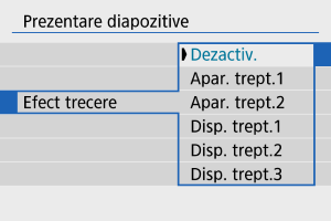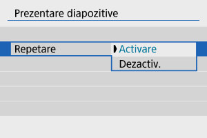 - Setaţi [Durată redare], [Repetare] (repetare redare) şi [Efect trecere] (efectul când se schimbă imaginea) pentru fotografii.