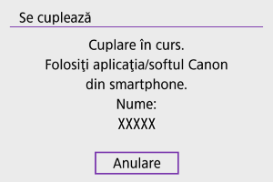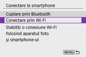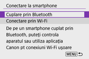 Porniţi Bluetooth şi Wi-Fi din ecranul de setări al smartphone-ului. Cuplarea cu aparatul nu este posibilă din ecranul de setări Bluetooth al smartphone-ului.