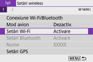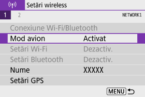 Dacă preferaţi să nu vă conectaţi prin Wi-Fi la aparat când este oprit, fie setaţi [Mod avion] la [Activat] sau setaţi [Setări Bluetooth] la [Dezactivare].