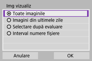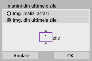 - Când este selectat [Img. din ultimele zile], imaginile realizate până la numărul de zile specificate înainte de data curentă vor deveni disponibile. Apăsaţi tastele