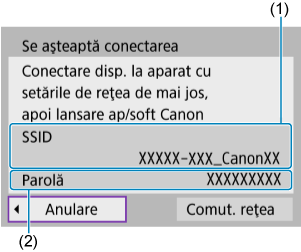- Parola nu va fi afişată sau solicitată dacă setaţi [Parolă] la [Niciuna] în [Setări Wi-Fi]. Pentru detalii, consultaţi Setări Wi-Fi.