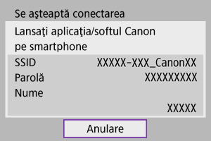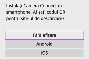 Conectare la smartphone]. Dacă este deja instalat Camera Connect, selectaţi [Fără afişare].