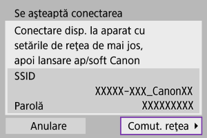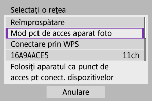- Pentru [Mod pct de acces aparat foto] afişat la pasul 5, consultaţi Mod punct de acces aparat.