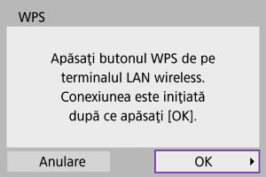 Această secţiune descrie cum să stabiliţi o conexiune Wi-Fi folosind un punct de acces compatibil cu WPS (mod PBC).