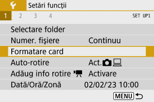 - Atunci când cardul este formatat, toate imaginile şi datele de pe card vor fi şterse. Chiar şi imaginile protejate vor fi şterse, aşa că asiguraţi-vă că nu aţi păstrat nimic din ceea va trebuie pe card. Dacă este necesar, transferaţi imaginile într-un calculator, etc., înainte de a formata cardul.