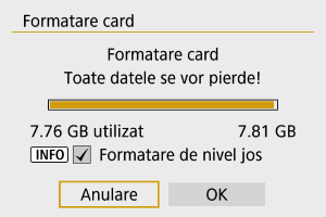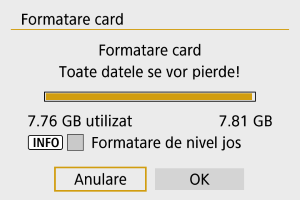 În timpul formatării de nivel jos, puteţi anula formatarea selectând [Anulare]. Chiar şi în acest caz, formatarea normală va fi realizată şi puteţi prin urmare să folosiţi cardul în mod obişnuit.