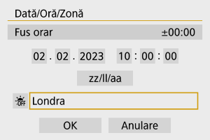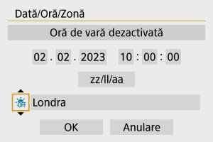 - Setările [Dată/Oră/Zonă] se pot reseta când aparatul este depozitat fără baterie, când bateria se descarcă sau când este expus la temperaturi negative pentru o perioadă mare de timp. Dacă se întâmplă acest lucru, setaţi-le din nou.