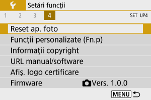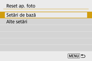 Resetează valorile implicite pentru funcţiile de fotografiere ale aparatului şi setările meniului.