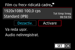Când Frecv rid cadre este setat la [Activare], camera poate înregistra 119,88/100,00 cps pentru a înregistra fişiere film cu o rată a cadrelor de 29,97/25,00 cps.