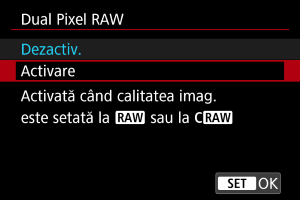 cu această funcţie activă produce imagini speciale Dual Pixel RAW care conţin informaţii dual pixel de la senzorul de imagine. Acest lucru este denumit fotografiere Dual Pixel RAW.
