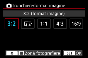 - Atingeţi [Zonă fotografiere] pentru a selecta cum să fie afişată zona de fotografiere când decuparea/formatul este setat la [1:1], [4:3] sau [16:19].