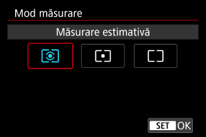 Sunt disponibile metode pentru a măsura luminozitatea subiectului (moduri de măsurare). În mod normal, se recomandă măsurarea estimativă. Măsurarea estimativă este setată automat în modurile Zonă de bază (exceptând modul :