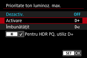 - [Îmbunătăţit]: Reduce zonele supraexpuse mai mult decât [Activare], în anumite condiţii de fotografiere.