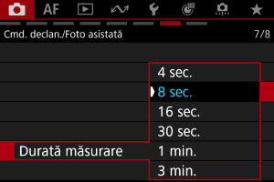 Puteţi seta cât de mult durează durata de măsurare (care determină durata de afişare a expunerii) după ce este declanşată automat de o acţiune precum apăsarea butonului declanşator până la jumătate.