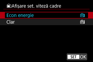 Puteţi seta rata cadrelor la afişare pentru ecranul de înregistrare la fotografiere. Alegeţi dacă doriţi să economisiţi energia bateriei sau să utilizaţi o rată a cadrelor mai mare pentru afişare.