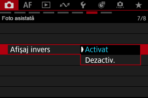 O imagine în oglindă poate fi afişată când fotografiaţi cu ecranul rotit către subiect (către partea din faţă a aparatului).