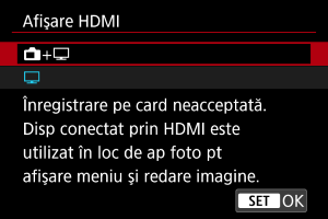 - Ieşirea HDMI fără informaţii previne afişarea avertismentelor despre spaţiul pe card, nivelul bateriei sau temperatura internă crescută () prin HDMI.