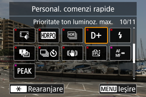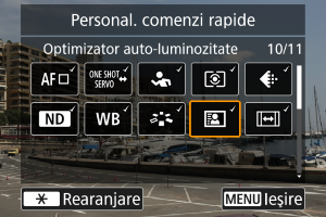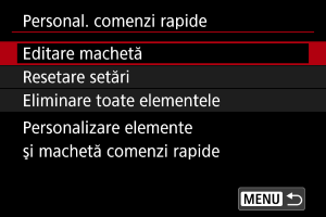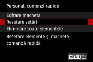 - Selectaţi [Resetare setări] pentru a reveni la setările implicite pentru elementele de pe ecranul pentru comandă rapidă şi la modul în care sunt aşezate.