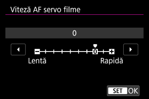 - Puteţi regla viteza AF (viteza pentru mutarea focalizării) de la viteză standard (0) la încet (unul dintre cele şapte niveluri) sau rapid (unul dintre cele două niveluri) pentru a obţine efectul dorit pentru film.