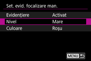 - Evidenţierea MF poate fi dificil de distins la valori ISO mari, în special când este setată o valoare ISO extinsă. Dacă este necesar, micşoraţi valoarea ISO sau setaţi [Evidenţiere] la [Dezactivare].