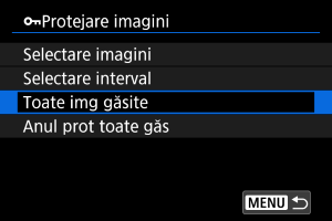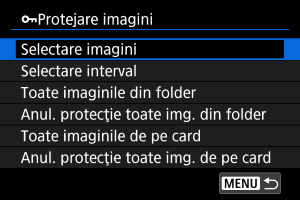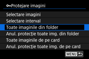 - Pentru a anula protejarea imaginii, selectaţi [Anul. protecţie toate img. din folder] sau [Anul. protecţie toate img. de pe card].