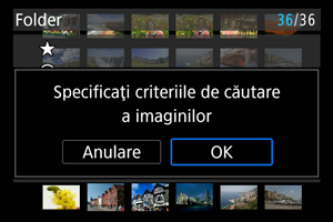 - Condiţiile de căutare pot fi anulate după operaţiuni care implică oprirea aparatului sau modificări pe card şi editarea, adăugarea sau ştergerea unor imagini.