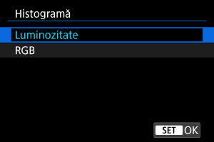 Histogramele afişează nivelurile de semnal în intervalul de tonuri. Sunt disponibile histograma pentru luminozitate (pentru a verifica nivelul general pentru expunere şi gradaţie) şi histograma RGB (pentru a verifica saturaţia şi gradaţia pentru roşu, verde şi albastru). Puteţi schimba histograma afişată dacă apăsaţi butonul când este afişat [