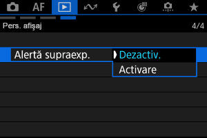 Puteţi specifica dacă să clipească afişajul în zonele supraexpuse pe ecranul de redare. Pentru a obţine mai multe detalii în imagini în zonele care clipesc unde doriţi să fie reprodusă mai bine gradaţia, setaţi compensarea expunerii la o valoare negativă şi înregistraţi din nou pentru un rezultat mai bun.