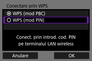 Acesta este un mod de conectare folosit cu un punct de acces compatibil cu WPS. În modul de conectare PIN (mod PIN), un număr de 8 cifre pentru identificare specificat pe cameră este setat la punctul de acces pentru a stabili o conexiune.