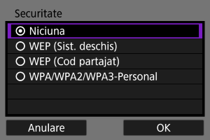 - Acelaşi tip de securitate trebuie să fie setat atât pe celălalt dispozitiv, cât şi pe cameră. Consultaţi Autentificare şi metode de criptare date pentru detalii despre tipurile de autentificare şi criptare.