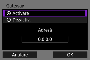 - Pentru a folosi un gateway, selectaţi [Activare], apoi selectaţi [Adresă].