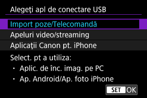 După ce selectaţi [Apeluri video/streaming], folosiţi cablul de interfaţă pentru a conecta aparatul la calculator, apoi porniţi aplicaţia.