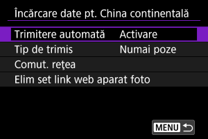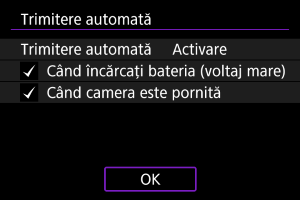 - [Când camera este pornită]: Trimiterea automată începe atunci când camera este pornită.