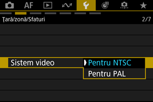 Setaţi sistemul video al televizorului folosit pentru afişare. Această setare determină rata cadrelor disponibile pentru filme.